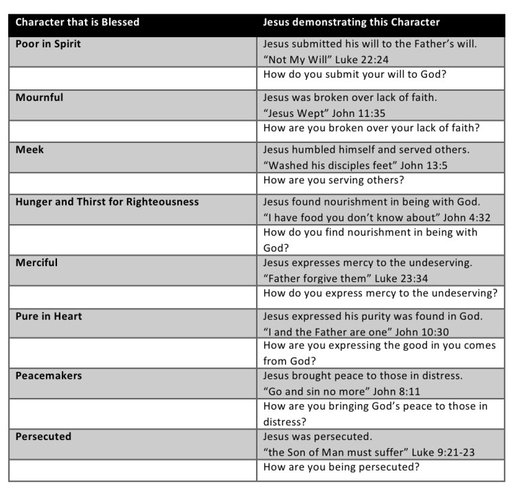 Jesus’s life is a perfect example of the Beatitudes. The Holy Spirt living in and through each follower of Christ will express character God blesses. Is your character an example of the Beatitudes? If not, why?